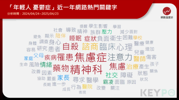 再透過《KEYPO大數據關鍵引擎》輿情分析軟體,調查「年輕人 憂鬱症」近一年的熱門關鍵字,出現最多的為「焦慮症、疾病、精神科、藥物」等心理疾病相關字詞。
