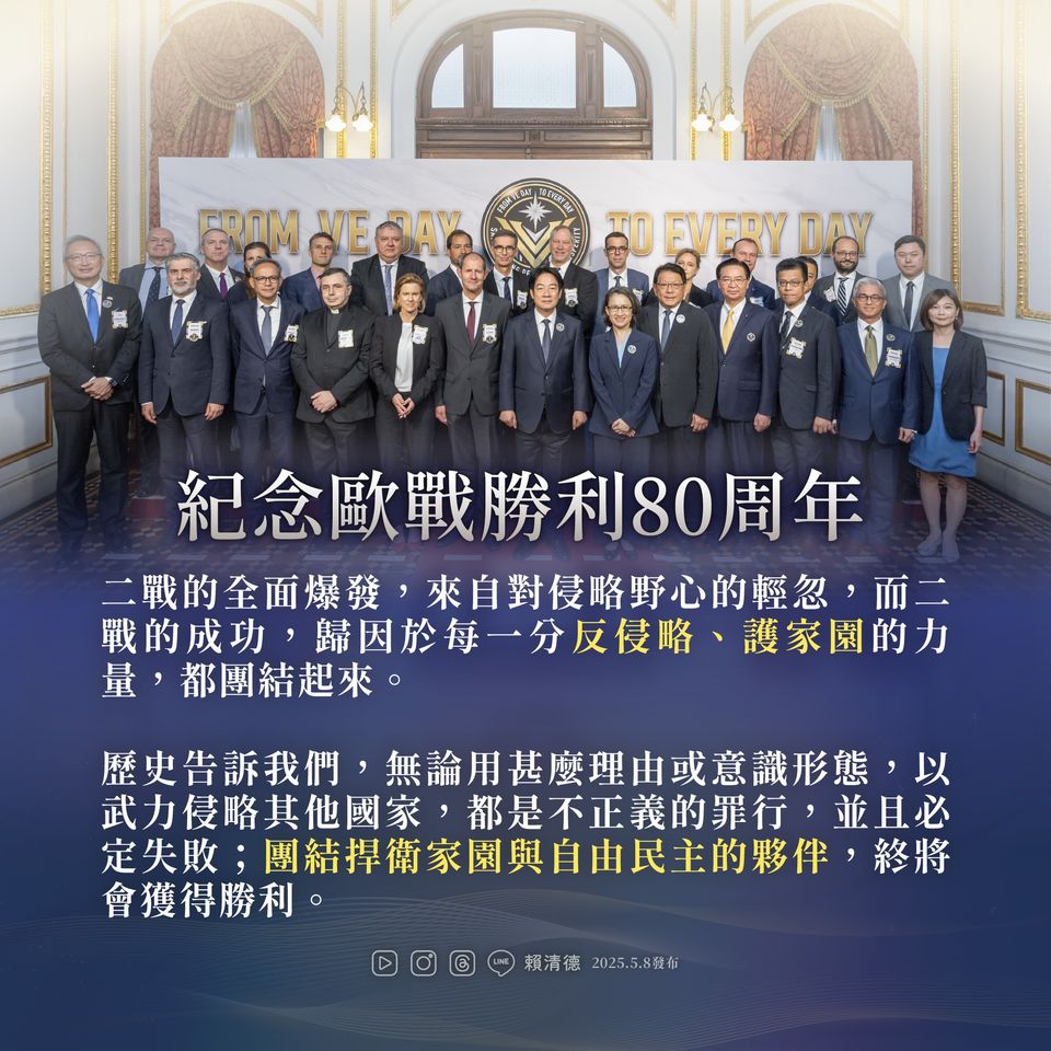 當賴清德總統在5月8日就歐戰勝利(正確說法是第二次世界大戰歐洲戰場)80周年發表談話,直陣「二戰慘痛經驗告訴大家,姑息只會讓侵略者食髓知味,膨脹更大野心與自滿利牙」;他指出,此時紀念歐戰勝利,具有團結反侵略、自由民主需靠實力守護,以及切勿對侵略行為掉以輕心等3大意義。