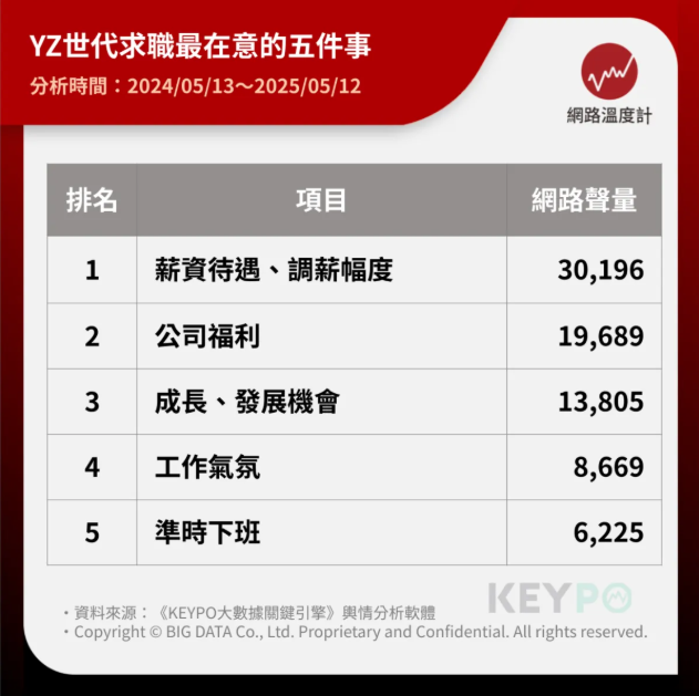 《網路溫度計DailyView》透過《KEYPO大數據關鍵引擎》輿情分析軟體,盤點出YZ世代最在意的五大求職關鍵,並揭露最能打中他們內心的五大公司福利,一起看看哪些公司走在前面,讓新世代擁有理想生活!
