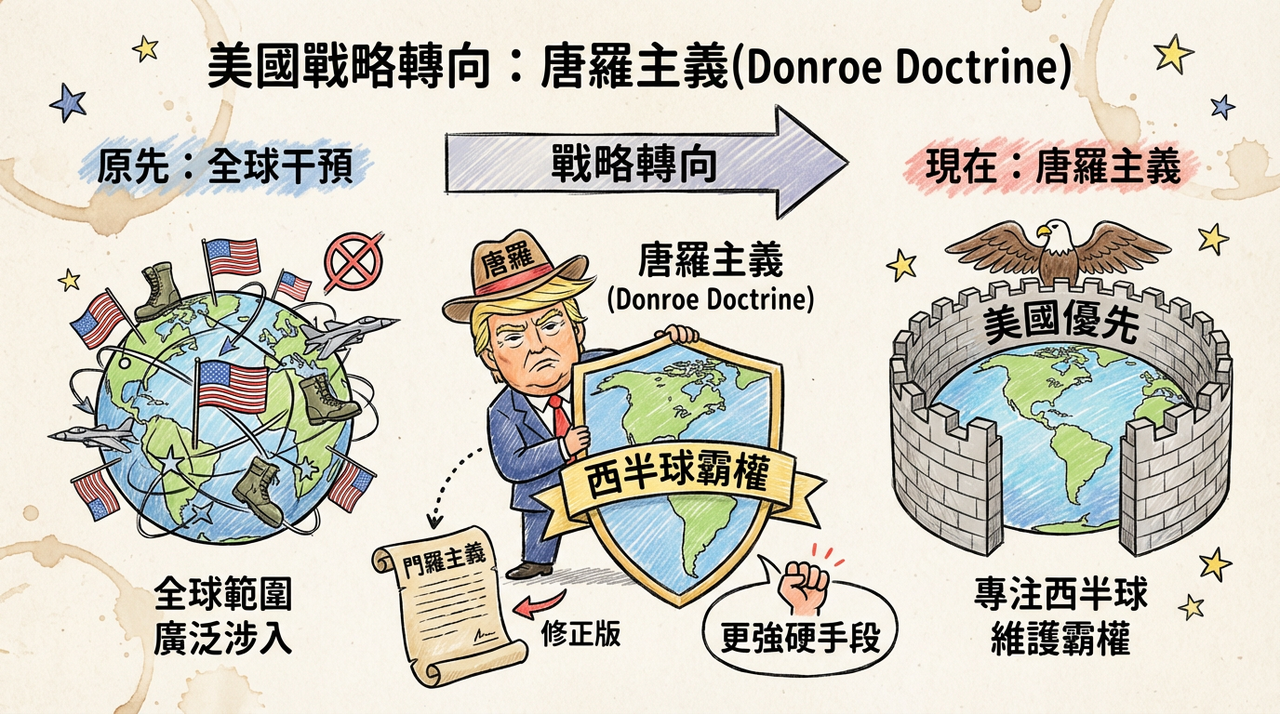 美國近年的全球戰略出現重大轉向,從原先的全球干預轉為帶有門羅主義色彩的「唐羅主義」(Donroe Doctrine)。所謂「唐羅主義」是川普修正的門羅主義,強調美國以更強硬手段維護西半球霸權地位。