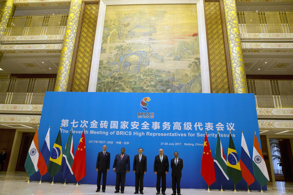 ▲金磚五國將在九月再次於廈門舉辦峰會,是中國將金磚國家與一帶一路相結合並深化合作關係的象徵性會議。圖為第七次金磚國家安全事務高級代表會議。(圖/達志影像/美聯社)