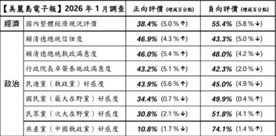 《美麗島電子報》最新公布的「2026年1月國政民調」,賴清德總統的信任度、好感度全面上揚,信任度還出現黃金交叉,滿意度也僅落後不滿意2%;民進黨的好感度也大幅提升,而國民黨、民眾黨的好感度則是下滑。