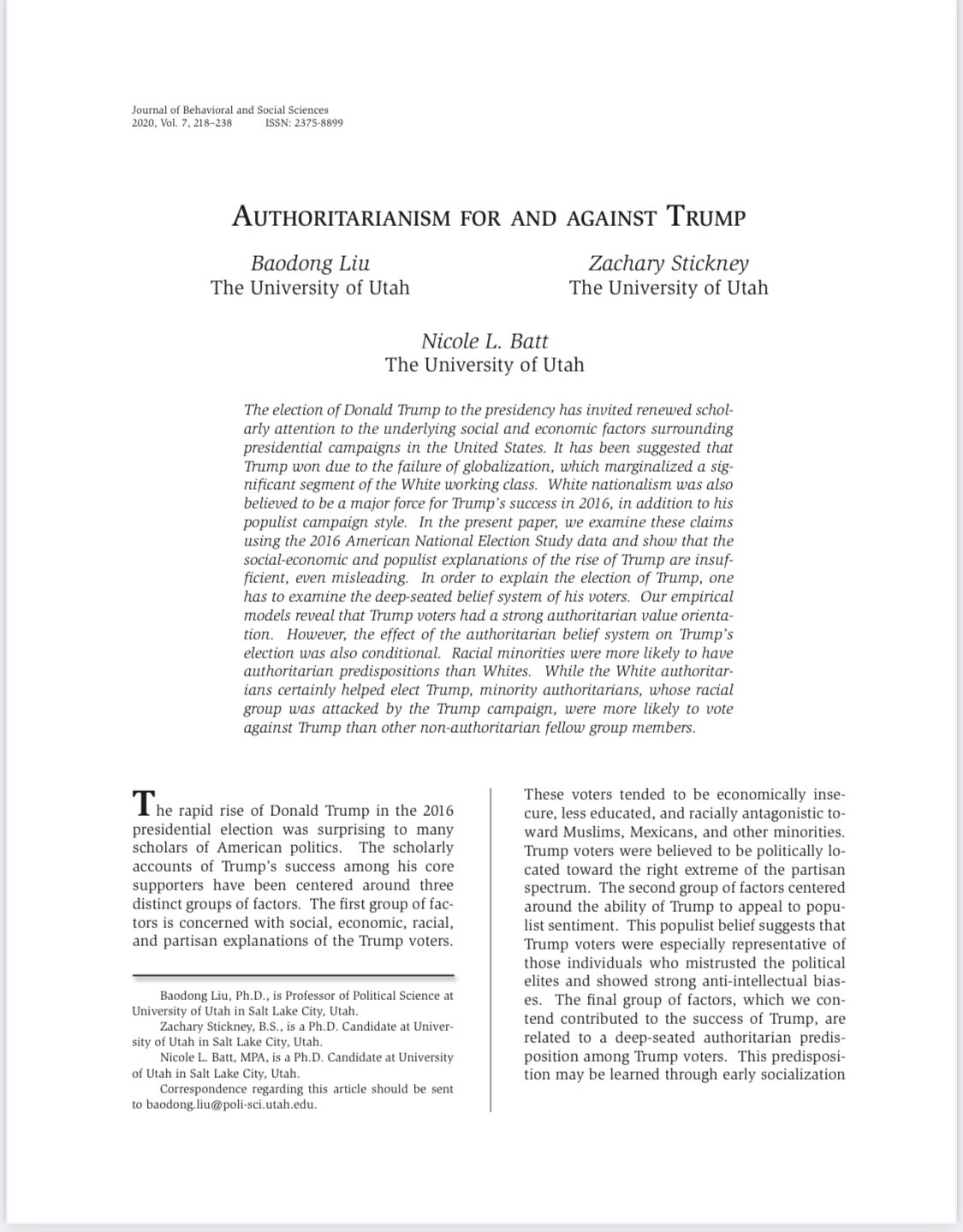 另外,正如我和我的兩位博士生在《行為和社會科學期刊》(Journal of Behavioral and Social Sciences)最新發表的「權威主義對川普的支持和反對」(Authoritarianism for and against Trump) 一文顯示,少數民族和白人對川普的支持來自於不同的信仰系統。