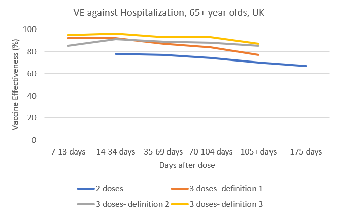 不過回到英國衛生局的報告,也有對65歲以上老人的防住院保護力,不管是什麼樣的住院定義,都顯示在15週的觀察內是續航力夠的。
