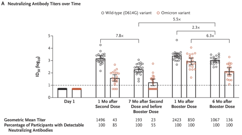 ▲一項近期NEJM的研究,顯示Moderna第三劑接種6個月後的抗體,會變成最高峰的1/6.3。(圖/N Engl J Med 2022; 386:1088-1091. DOI: 10.1056/NEJMc2119912)